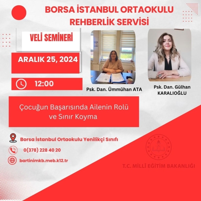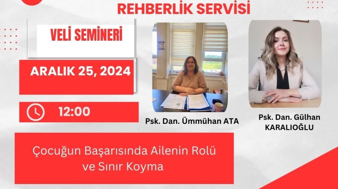 Siz Değerli Velilerimiz, Okulumuz Rehberlik Servisi Birimimizce 25 Aralık Çarşamba Günü Saat 12:00'da yapılacak "Çocuğun Başarısında Ailenin Rolü ve Sınır Koyma" Seminerine Davetlisiniz.